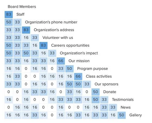 I was able to get the website’s analytics to get a better idea of what pages were visited the most by users. The analytics showed that the most viewed page was a news page that didn’t provide information on the youth programs. The lack of information structure could be a cause of users being directed to an unexpected page. I decided to conduct a card sort test to determine an optimal way to restructure the navigation. Using a software like Optimal Workshop, I was able to get a similarity matrix to help start with navigation re-structuring.