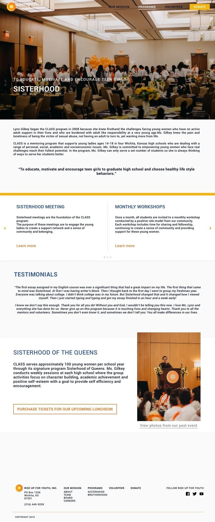 Rise Up for Youth is an organization that strives to inspire and motivate the youth of Kansas to unlock their full potential. Through education, mentoring and empowerment, Rise Up for Youth provides young people with support to cope with difficulties in life and to succeed in adulthood. Currently operating in five high schools, Rise Up for Youth wants to continue reaching out to other schools in Wichita and provide their services to the community. They felt that their current website was outdated and wanted something more modern to help spread their mission.